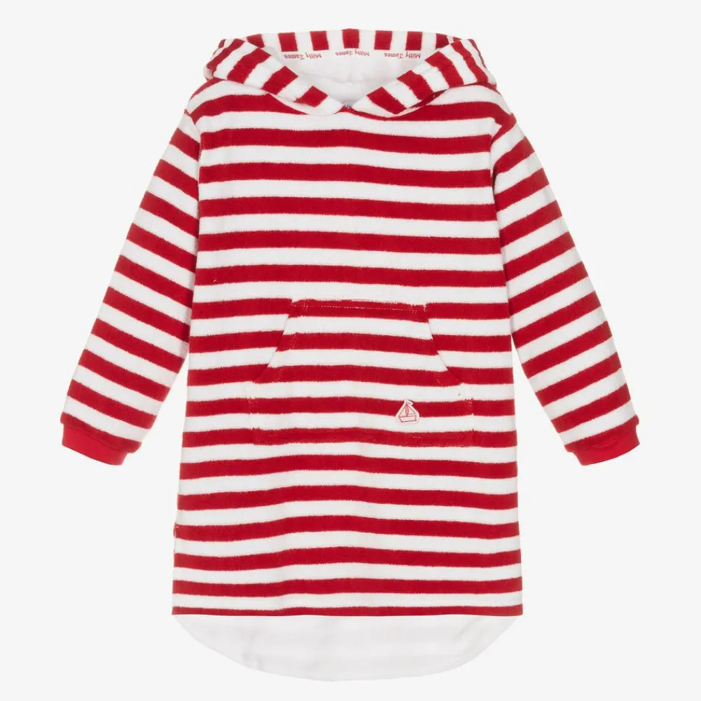 Exclusive to Childrensalon, a red and white striped cotton robe for girls and boys by Mitty James, ideal for the beach or pool. Hooded and soft, it is made in absorbent towelling with a logo patch on the useful pouch pocket. Easy to wear, it is loose-fitting and just right as a comfortable, practical cover-up.