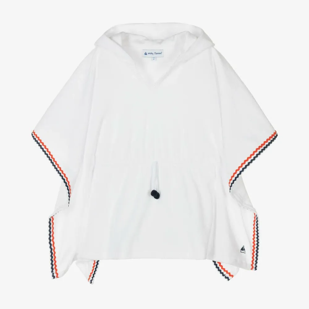 Exclusive to Childrensalon, a white hooded poncho towel for girls by Mitty James, with navy blue and white ric rac trims. Made in soft, absorbent towelling, it is ideal for wearing over a swimsuit on the beach or by the pool. It has a hood lined in soft jersey and an elasticated waist for a neat fit, with a faux drawstring and navy blue pom-poms. The brand's logo is by the hemline, embroidered in navy blue.
