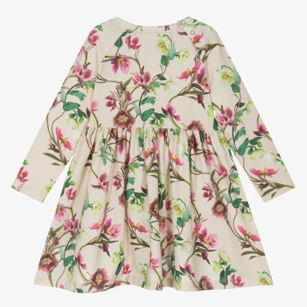 A beige long-sleeved dress for girls by Molo, made from soft organic cotton jersey. Printed with a pretty pink and green floral pattern, this fit and flare style has practical popper fastenings on one shoulder to help with dressing.