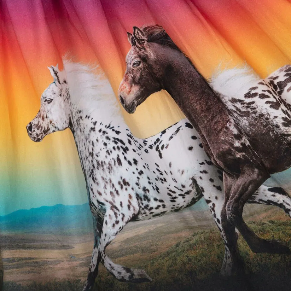 Casual dark navy blue skater dress for girls by Danish brand Molo, made in soft organic cotton. The fitted bodice is made in comfortable and stretchy ribbed jersey with long sleeves. Gathered around the waist, the full-circle poplin skirt has a colourful sunset and horse print.