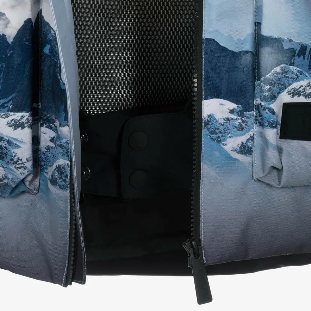 Boys cool blue and black alpine mountain print ski jacket by Molo. With a polar fleece lining and a mesh layer for breathability, it has reflective logo trims, zip-up front pockets and a further ski pass pocket on the sleeve. The large detachable hood has an elasticated trim for a good fit and the stretchy internal cuffs have useful thumb holes. The jacket has a useful chin guard on the zip fastening and an internal popper fastening snow skirt for extra protection. This item contains recycled materials.
