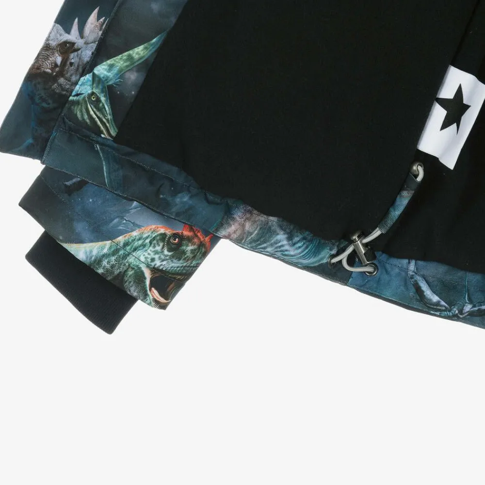 A navy blue technical ski jacket for boys by Molo, printed with a cool 'dinosaurs in space' pattern. This waterproof jacket is warmly padded and lined in soft and cosy polar fleece. Fastening with a zip, it has a detachable hood, with an elasticated trim to fit easily over a helmet, stretchy cuffs and zip-up front pockets. The hem can be adjusted to help keep heat in and for added visibility, there is reflective detailing.