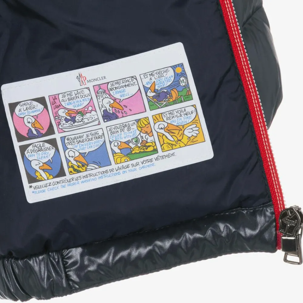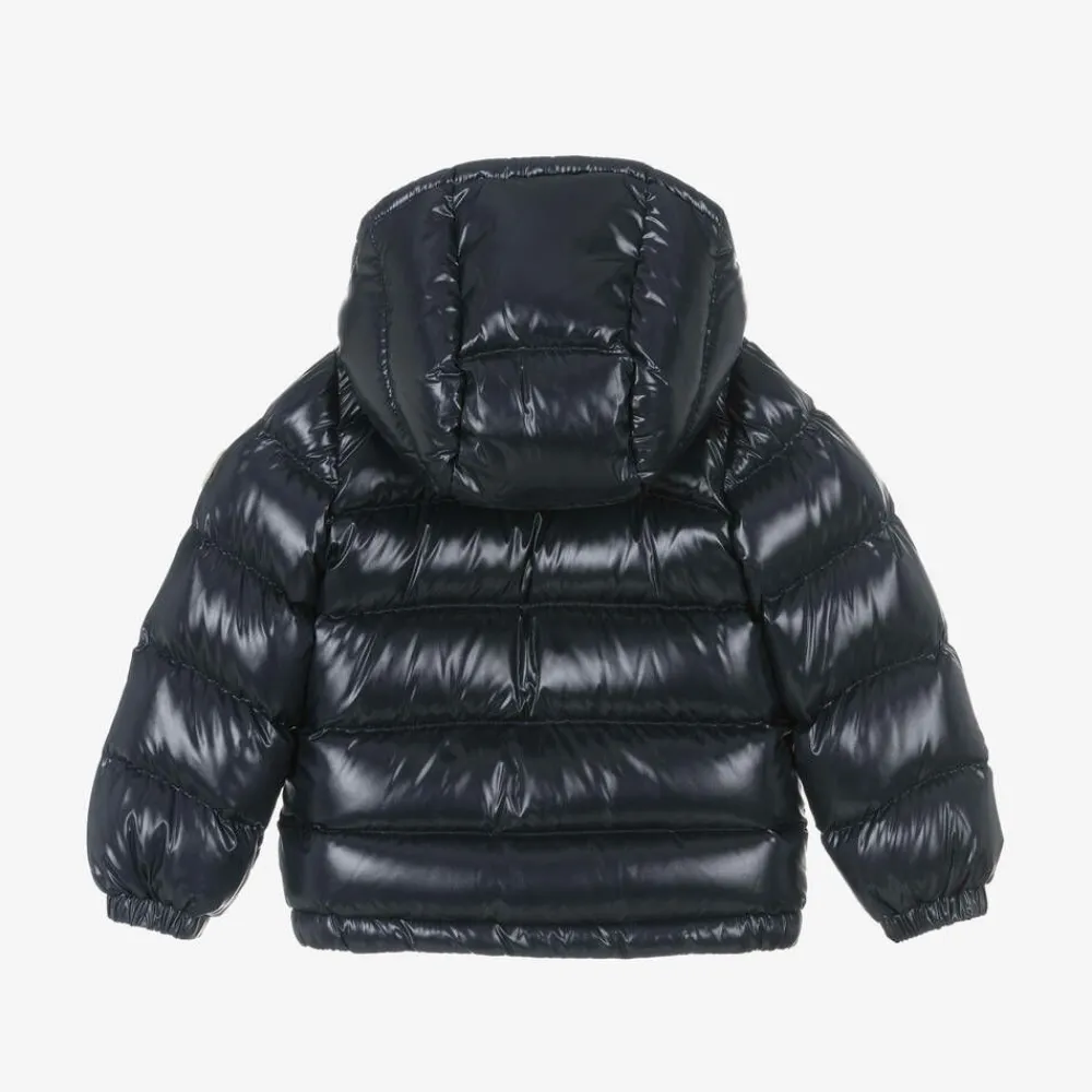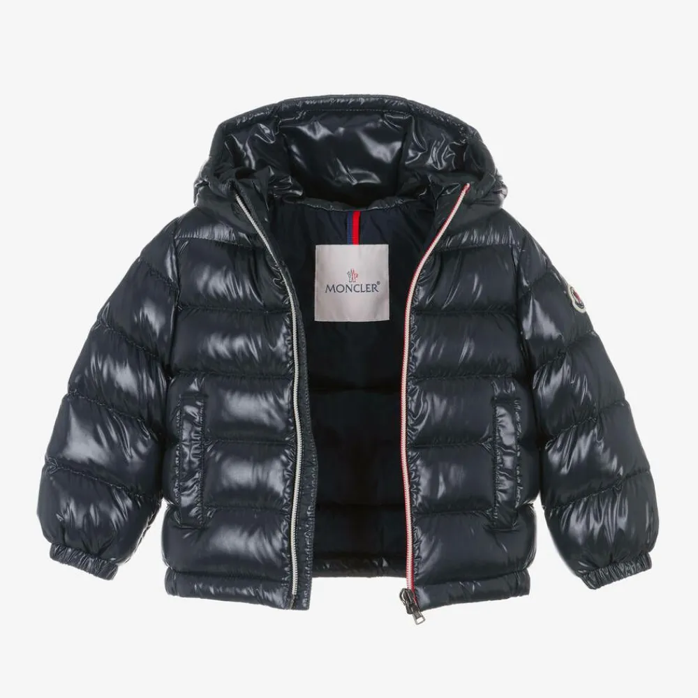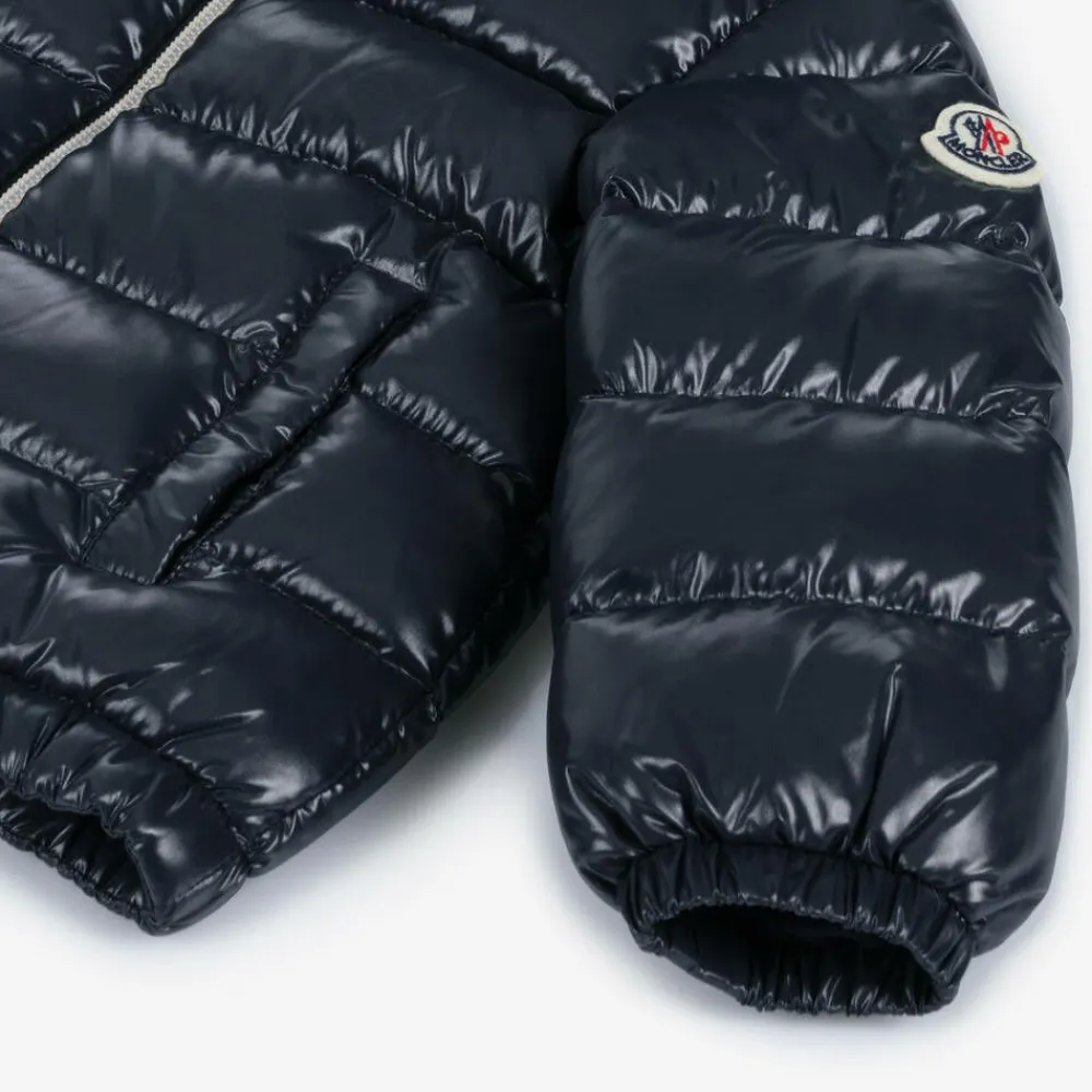 Navy blue puffer jacket for little boys and girls by luxury brand Moncler Enfant, made in shiny laquƩ fabric. Water repellent and breathable, it is warmly padded in soft down for superior comfort and warmth. There are elasticated cuffs to help keep out chilly winds, with a fixed hood and popper-fastening front pockets. The exposed tricolour front zip fastening has a branded puller, and the designer's signature felted badge is visible on one sleeve.