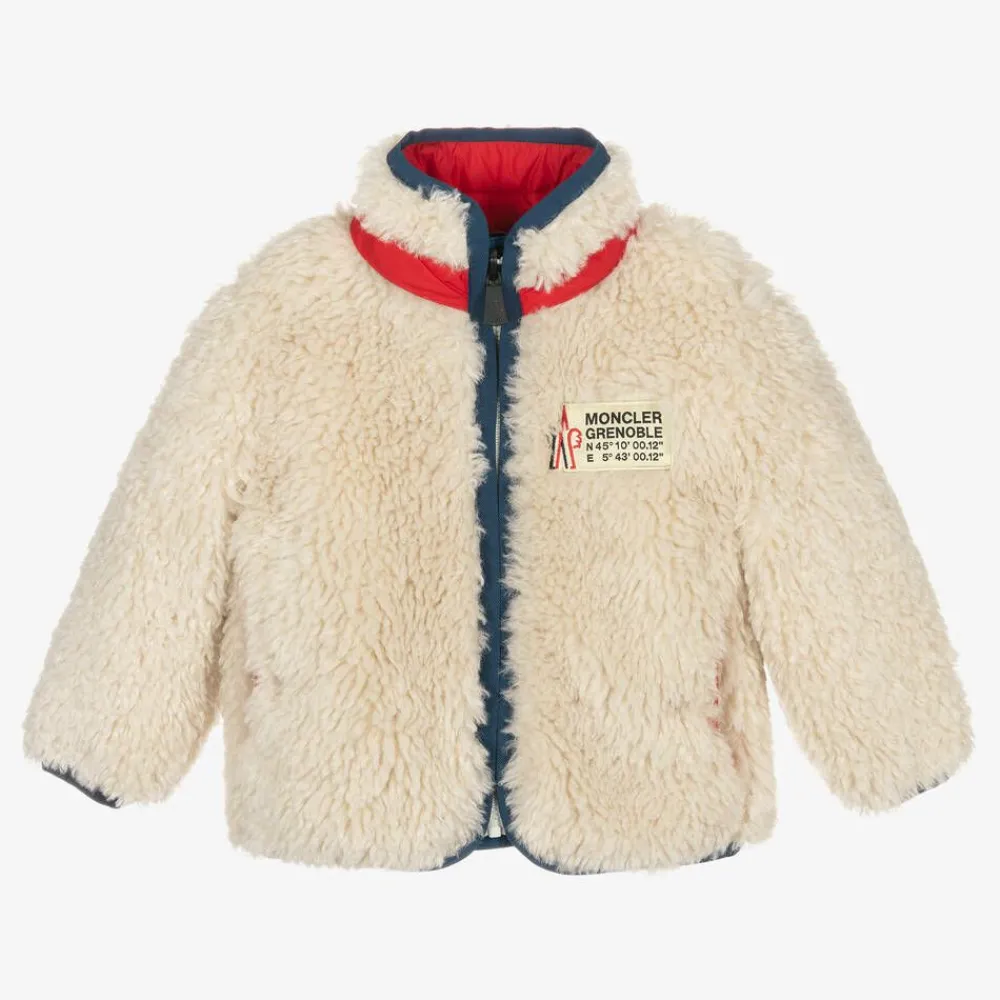Keep cosy and warm in this super stylish reversible jacket for boys by Moncler Enfant, from the brand's Grenoble après-ski collection. The beige side is made in beautifully soft teddy fleece, with a branded patch on the front. The red side is in silky smooth nylon and has signature logo embroidery on the chest. Luxuriously padded in soft down, the jacket fastens with a zip and poppers down the front and has a detachable puffer hood. Both sides have contrasting blue trims and useful popper fastening pockets.
