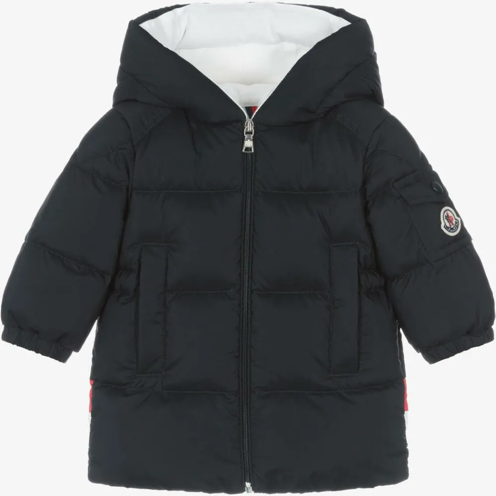 Navy blue hooded parka coat for little boys by Moncler Enfant, made in the brand's smooth, recycled longue saison fabric. Padded with luxurious down for warmth, it has a soft cotton jersey full lining and elasticated cuffs. The back has red, white and navy blue tricolour stripes across the hem. There is a small, popper-fastening pocket on one sleeve with the brand's signature felted logo patch. The popper-fastening front pockets are lined in soft jersey and the jacket fastens with a zip.