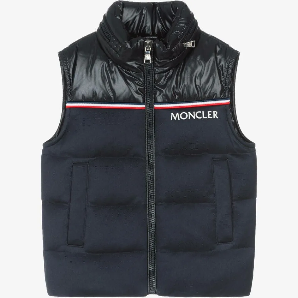 Boys navy blue gilet by luxury designer Moncler Enfant, padded with warm down. Striped in the brand's iconic colours, it has a white rubber logo on the chest. With a two-tone style, the bodice is matte and the shoulders are made of silky materials. It fastens with a shiny silver logo zip on the front and has a zip-fastening pack-way hood on the collar.