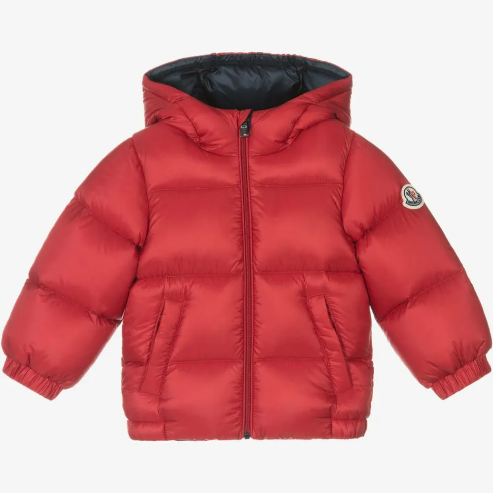 Red hooded puffer jacket for little boys by luxury brand Moncler Enfant, with the iconic logo patch on the sleeve. Made and lined in the brand's super lightweight and water-repellent nylon doudoune legere, it is down padded for excellent warmth. Easy to zip up on the front, it also features elasticated cuffs to keep the chills out, a silky navy blue lining and popper fastening front pockets.