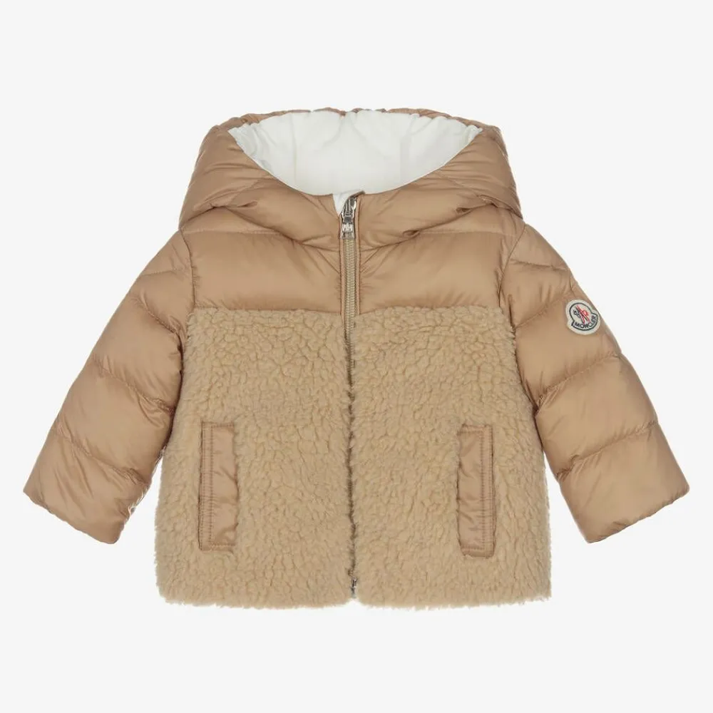 Cute dark beige hooded puffer coat for little boys and girls by luxury brand Moncler Enfant. Padded with lightweight down for superior warmth, the jacket has a silky smooth exterior with beautifully soft teddy fleece panelling. Lined in comfortable cotton jersey, it fastens easily with a branded zip and has popper-fastening pockets. For a signature finish, the designer's instantly recognisable logo patch can be seen on one sleeve.