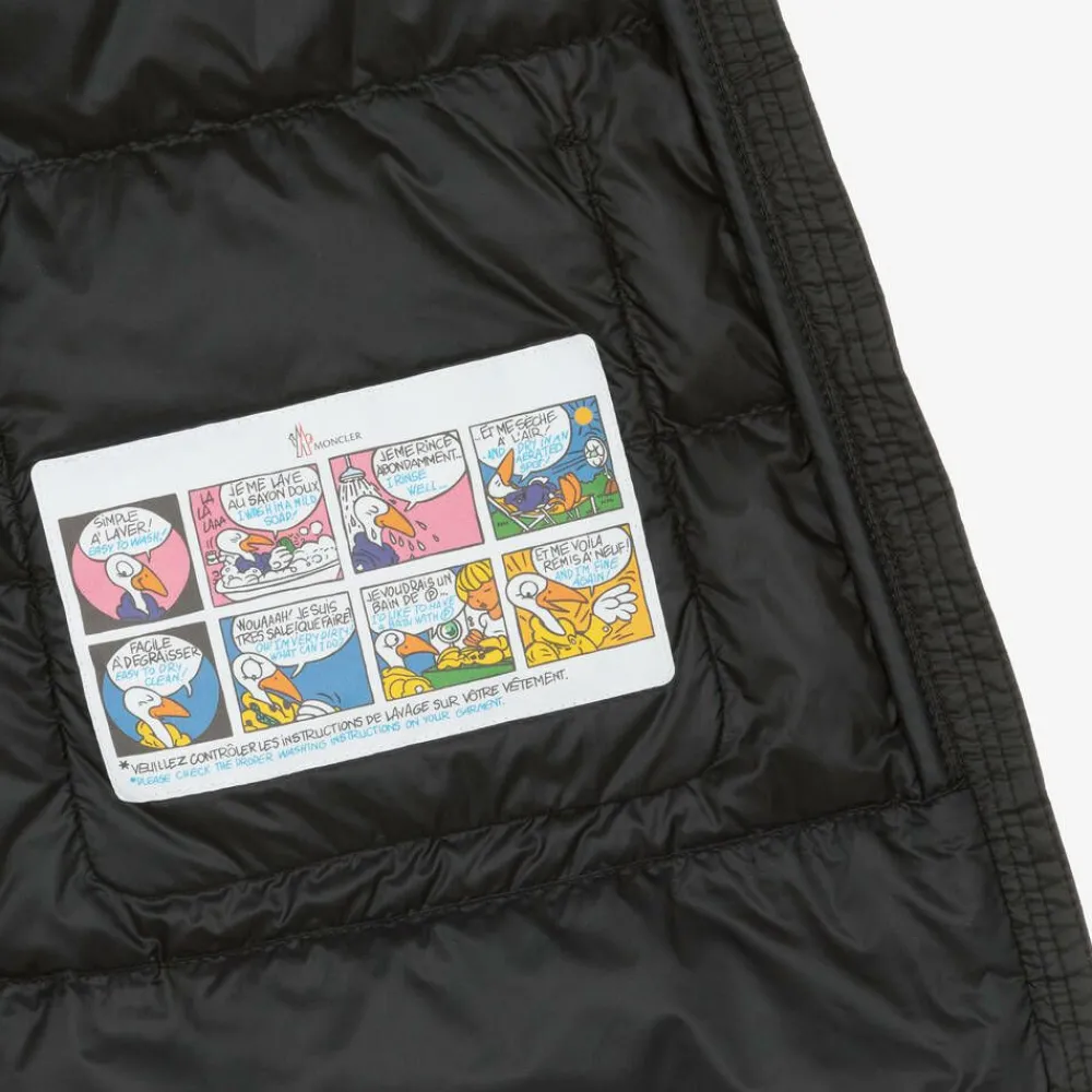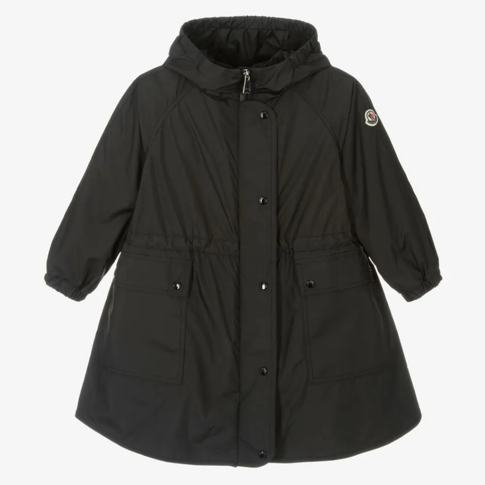 Versatile black hooded 2-in-1 coat and gilet for girls by Moncler Enfant. The lightweight coat has a fixed hood, with patch pockets on the front secured with branded poppers. The signature logo badge is on one sleeve for instant brand recognition, it has gently elasticated cuffs and fastens with a zip and branded poppers on the front. There is an internal drawstring on the waist for a comfortable fit. Inside is a silky, lightly padded gilet, kept in place with zips and poppers. It can be worn separately, or as an extra layer in chilly weather. It has a signature logo badge and useful patch pockets.