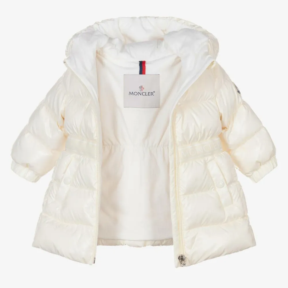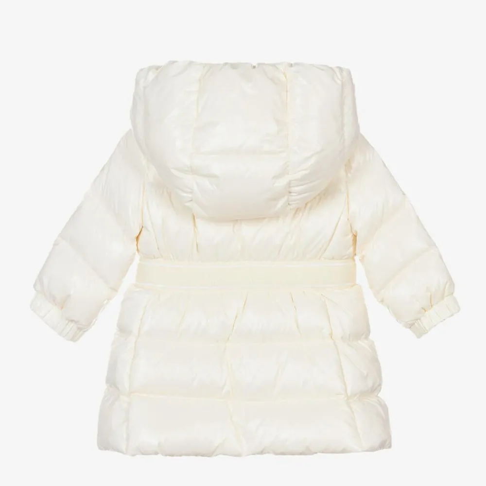 Stylish ivory hooded puffer coat for little girls from Moncler Enfant. Warmly padded with luxurious down, it has a recycled, silky water-repellent exterior and a comfortable soft jersey lining. For added protection from the elements, the hood and cuffs are elasticated and the coat fastens easily with a zip. For an unmistakable designer look, the coat has a branded tape waistband, logo embossed poppers on the pockets and the signature logo patch on one sleeve.