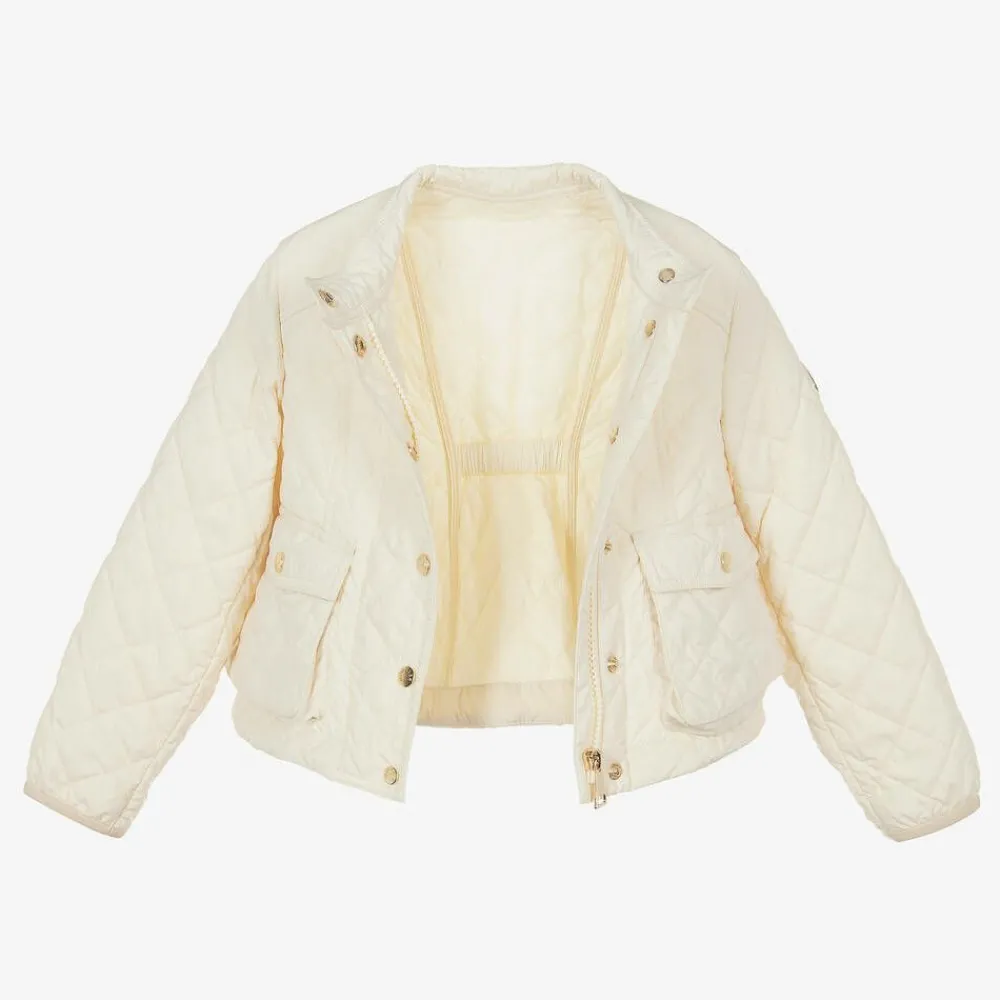 Ideal for the milder weather, this diamond-quilted ivory jacket for girls is by luxury brand Moncler Enfant. Lightly padded, the silky smooth fabric is water repellent and made from recycled material. The cuffs are gently elasticated and the front zip closure is covered by a storm flap. The jacket has spacious front pockets and the slightly flared hem creates a lovely feminine silhouette. For a distinctive finish, there are gold-tone branded popper fastenings, with the designer's iconic felt logo patch on one sleeve.