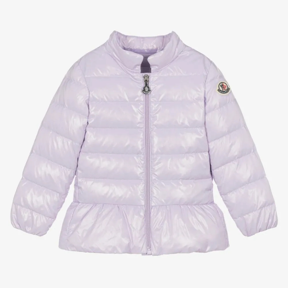 Pretty lilac purple jacket for little girls by luxury brand, Moncler Enfant. Padded with down for lightweight warmth, this cute jacket has a girly, peplum style hem and elasticated sleeves to keep out cold chills. It easily fastens with a smooth zip on the front, and has a versatile, pack-away hood on the back of the neck. Signing off the style with a branded stamp, it has the iconic felt logo badge on one sleeve.