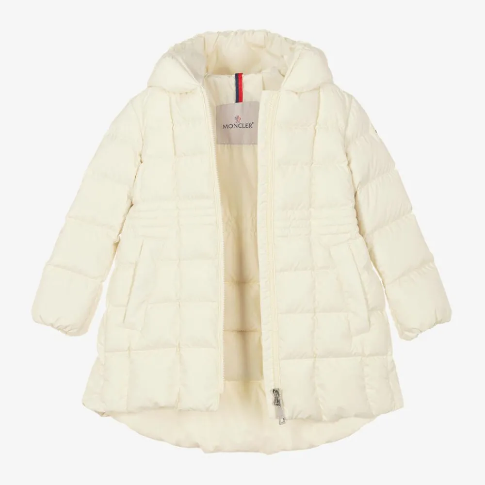 Long ivory parka-style puffer coat for girls by luxury brand Moncler Enfant, padded with warm down. Made in silky, matt, recycled fabric, this water-repellent coat has a cosy, fixed hood, an elasticated waist for shape and a dipped hem at the back. On the front are useful pockets secured with poppers and an exposed zip fastening. The designer's signature logo badge is sewn on one sleeve, and the cuffs are gently elasticated. The coat is lined in soft satin for comfort.