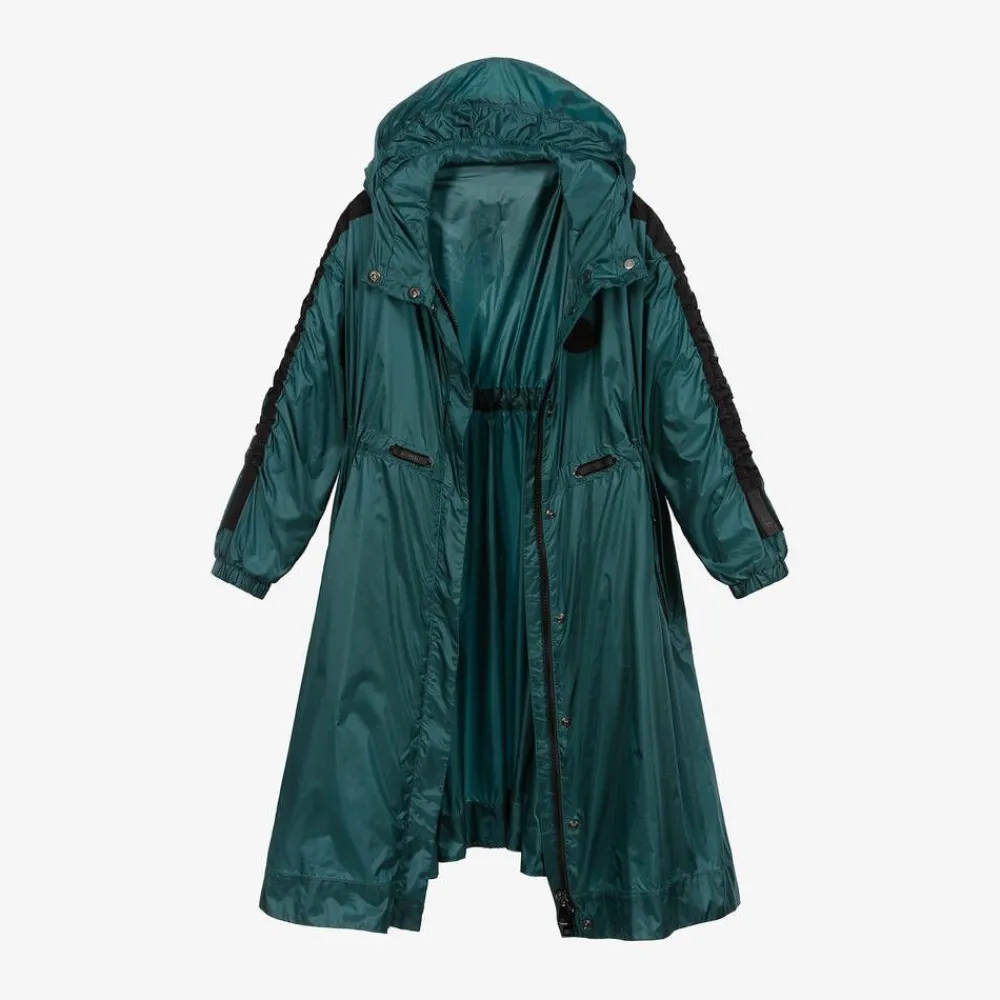 Metallic green long coat for girls by luxury French brand Moncler Enfant, made in soft silky nylon. Lightweight, it has elasticated black trims and logo tabs on the sleeves, zip fastening pockets and a black rubber logo patch on the chest. The waist can be adjusted using the internal elastics.