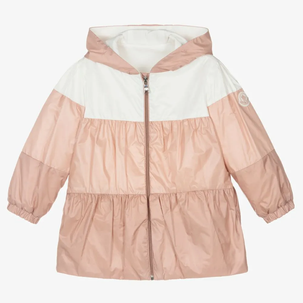 Dusky pink and white water repellent zip-up jacket for little girls, by luxury brand Moncler Enfant. Made in silky nylon with a matte-chic feel, it has the iconic felt logo on one sleeve, pretty tiered details, and a cotton lining for comfort.