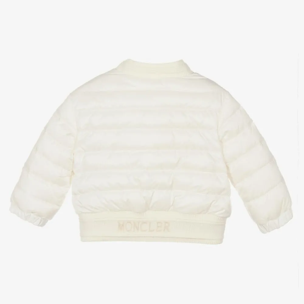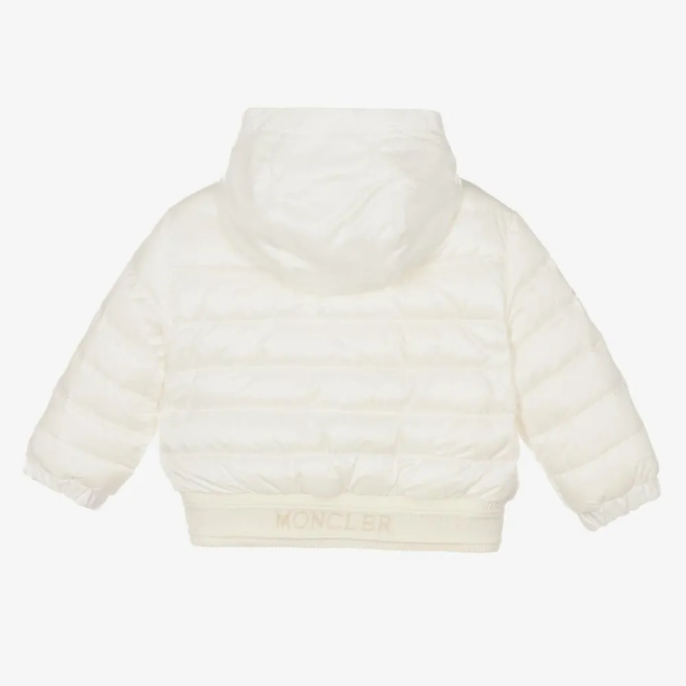 Girls pretty white down padded jacket by luxury designer Moncelr Enfant with knitted ivory logo trims. Soft and silky with a comfortable jersey lining, this stylish jacket has a concealed hood which folds neatly inside the collar, ideal for rainy days. There are two front pockets, signature boudin quilting, and the brand's signature felt patch is appliquéd on one sleeve for an added branded touch.