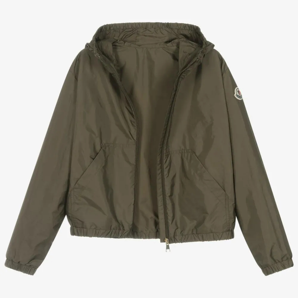 Khaki green hooded windbreaker jacket for teen girls by luxury fashion house Moncler Enfant. For instant designer appeal, there is a large tonal mesh logo on the back, with the signature felt patch on one sleeve. Silky and lightweight, this water-repellent jacket is both stylish and practical. Elasticated trims keep out chilly winds and the high neckline offers added protection. Fastening with a branded zip, the jacket has front patch pockets and a lightweight satin lining.