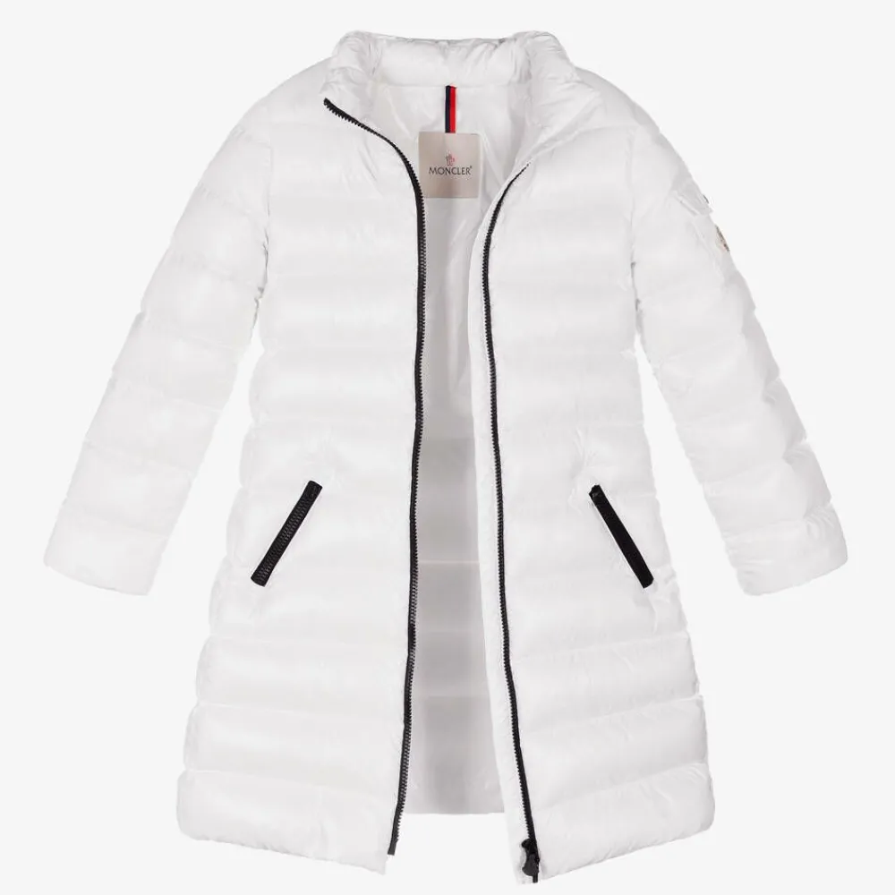White puffer coat for teen girls from Moncler Enfant. A signature designer look, it is made and lined with soft and silky fabric, with contrast black trims and a felt logo patch on the popper-fastening sleeve pocket. The luxurious down padding and water-repellent treatment will help to ensure she stays comfortable and cosy in style. It has a front zip fastening, useful zipped front pockets, and a detachable hood for alternative looks.