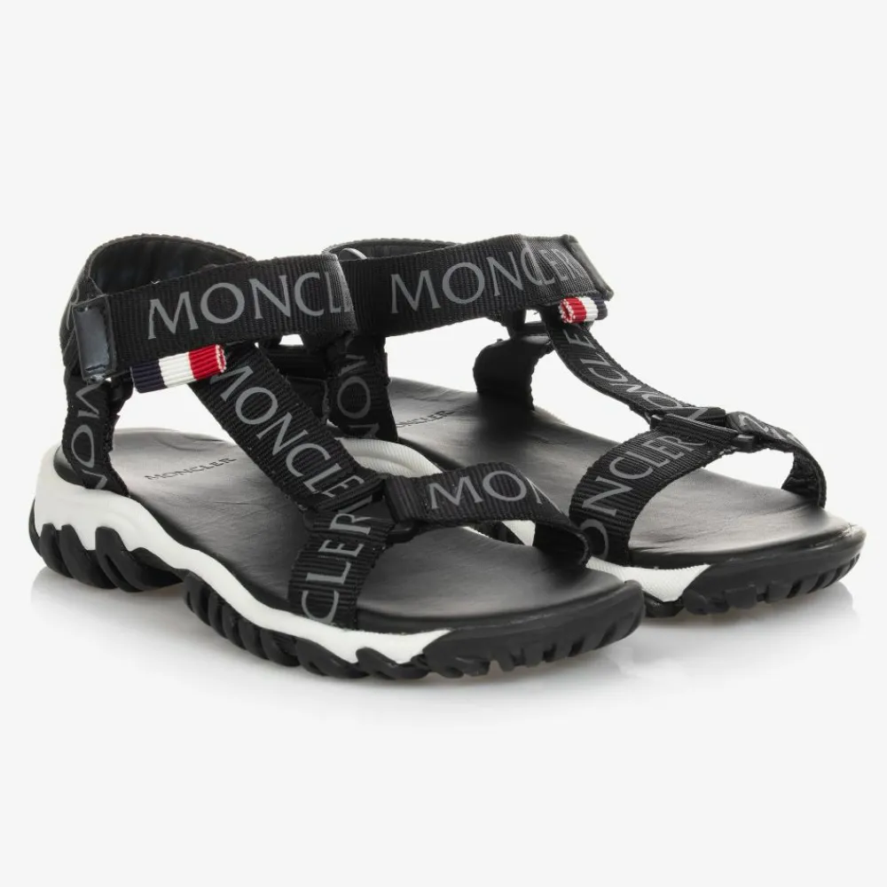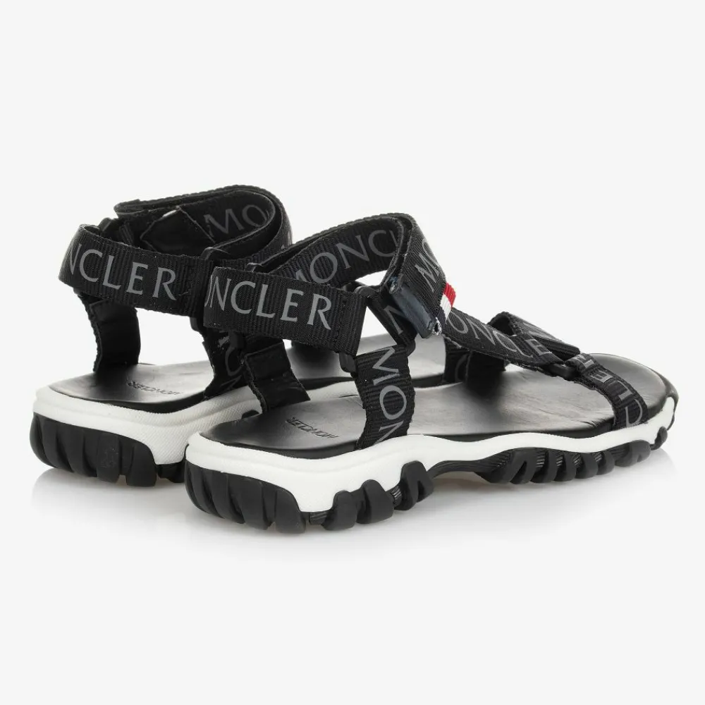 Luxury black hiking style sandals for boys and girls by Moncler Enfant. They have sturdy canvas straps with grey logo lettering and the brand's iconic tricolour tabs on the adjustable velcro fastening ankle straps. The soft leather insole is moulded for comfort and they have black and white deep tread outer soles for a good grip.
