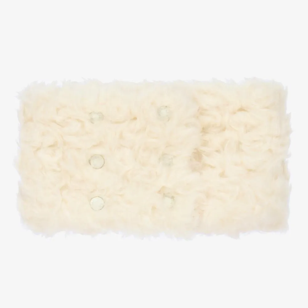 Ivory neck warmer for girls by luxury French brand Moncler Enfant, made in soft, fluffy faux fur. Warm and cosy, it has the brand's signature logo patch on the front and there are popper fastenings on the back.