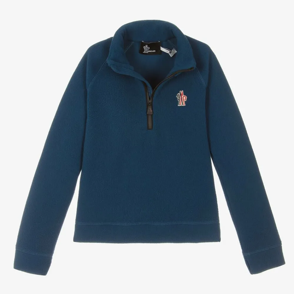 Part of the brand's Grenoble collection, this dark teal blue fleece top for boys and girls is a Mini-me style by luxury brand Moncler Enfant. Made from beautifully soft and stretchy fleece, it offers extra warmth and added protection against the elements. A stylish base layer for the slopes, it features a taped half-zip fastening and a high collar with the label's padded signature nylon fabric trim. The embroidered logo patch and black zip pull add signature detailing.