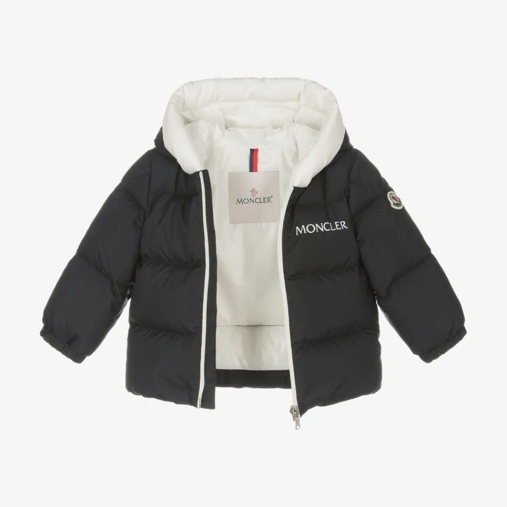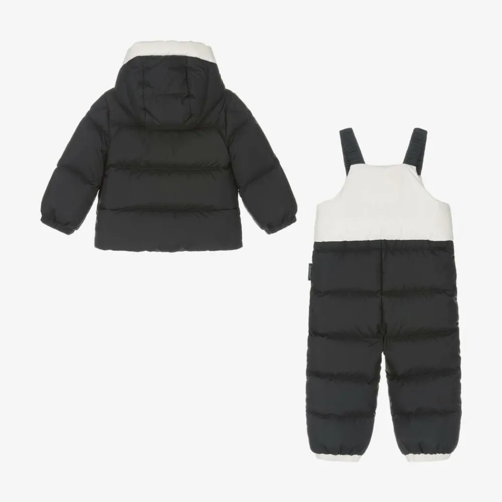Silky soft with a matte finish, this navy blue puffer snowsuit for little boys and girls by luxury brand Moncler Enfant. Lightweight and water repellent, it is warmly padded in soft down for superior comfort and warmth. There are elasticated cuffs to help keep out chilly winds. The jacket has a fixed hood, popper-fastening side seam pockets, and a front zip closure. The designer's logo name is printed on the chest and their signature felted badge is on one sleeve. The salopettes have an elasticated waist and shoulder straps for a comfortable fit, with an exposed front zip fastening.