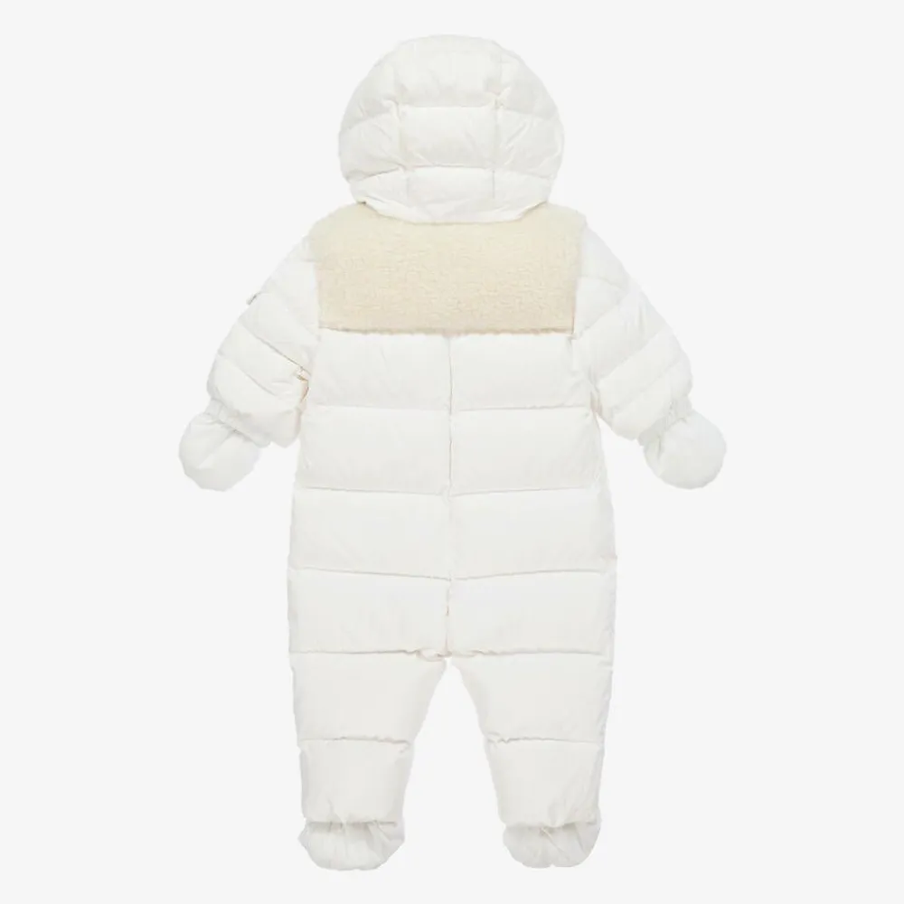 Ivory hooded snowsuit for baby boys and girls by luxury brand Moncler Enfant, made with recycled materials. Silky smooth, it is made in a matte fabric that is both water repellent and breathable and has a beautifully soft cotton jersey lining. It is down-padded for superior warmth and comfort and fastens with a branded zip fastening on the front. The detachable mittens and booties easily attach with poppers. Soft, ivory teddy fleece across the shoulders adds a stylish touch. One sleeve has a patch pocket, accented with a branded popper and the instantly recognisable felt logo patch.