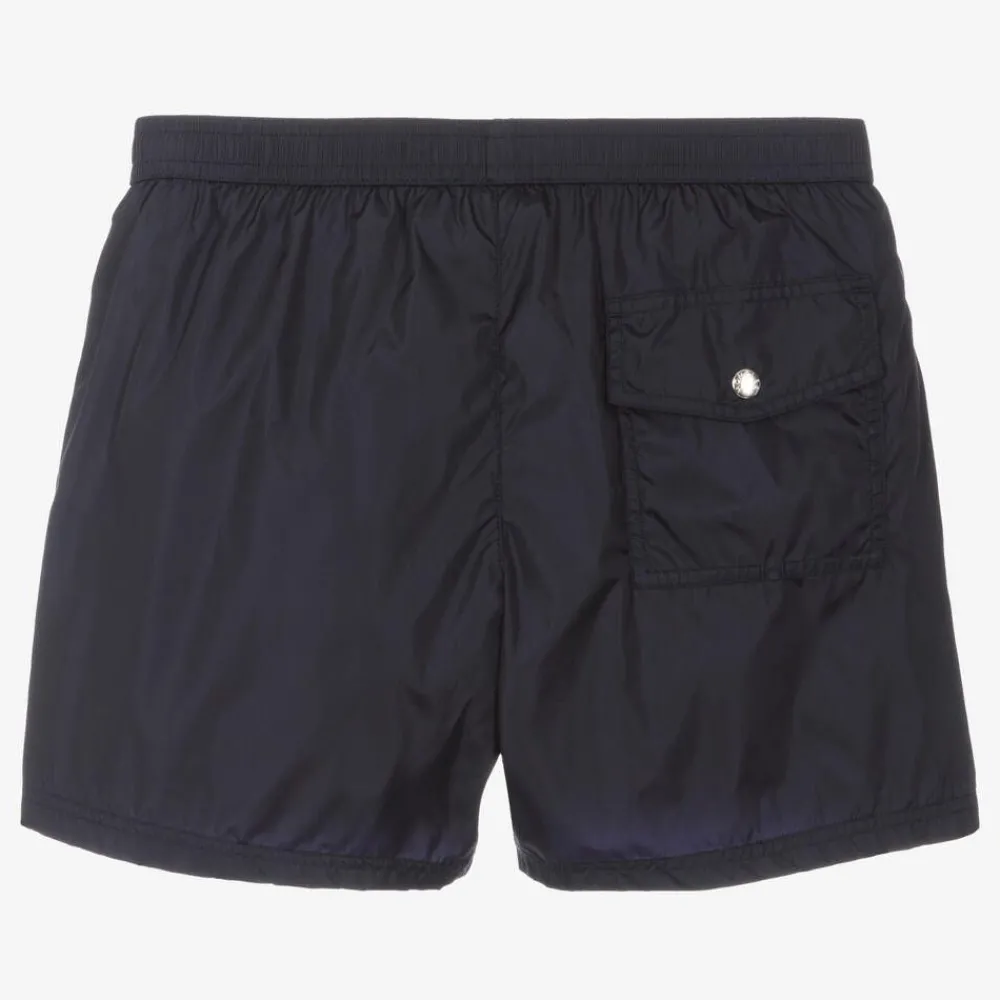 From luxury brand Moncler Enfant, a pair of navy blue swim shorts for teen boys with red and ivory piping trim. Instantly recognisable, they have the designer's signature felted logo patch on the front and a branded popper on the back pocket. These lightweight shorts are made in silky smooth fabric with and soft and stretchy lining and a comfortable elasticated waistband.