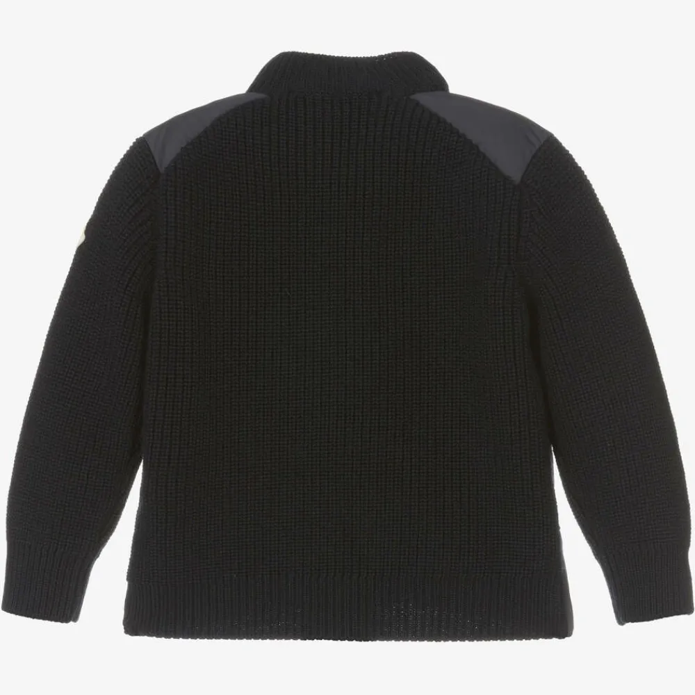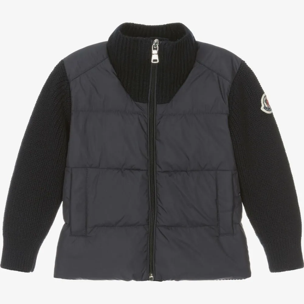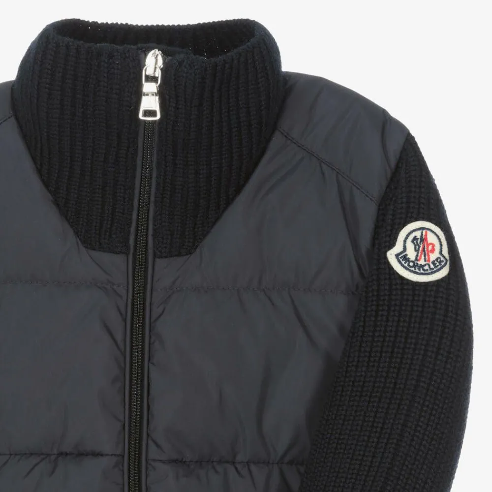 Navy blue zip-up top for little boys by luxury brand Moncler Enfant. Made in soft virgin wool in a chunky ribbed knit, the silky smooth puffer-style front is down padded for extra warmth with cotton jersey lining for comfort. This cool hybrid look features the iconic felt logo patch on one sleeve and two popper fastening hand pockets.