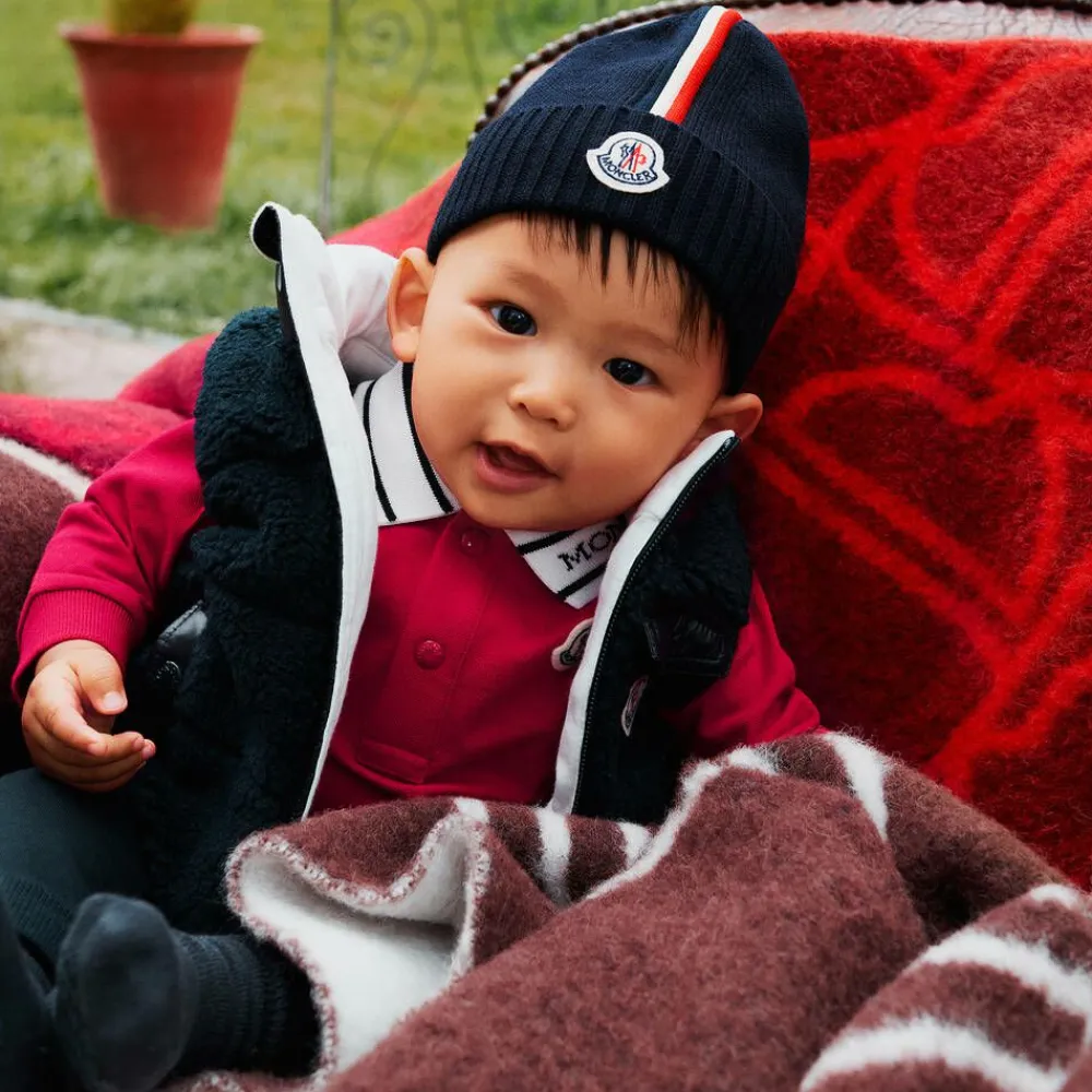 A logo-inspired twist on the classic style, this red long-sleeved polo top for little boys is by Moncler Enfant. It is made in soft and breathable cotton piqué with navy blue trims, ribbed cuffs and popper fastenings. In addition to the iconic patch on the chest, the white collar has an eye-catching logo design with sporty stripes.