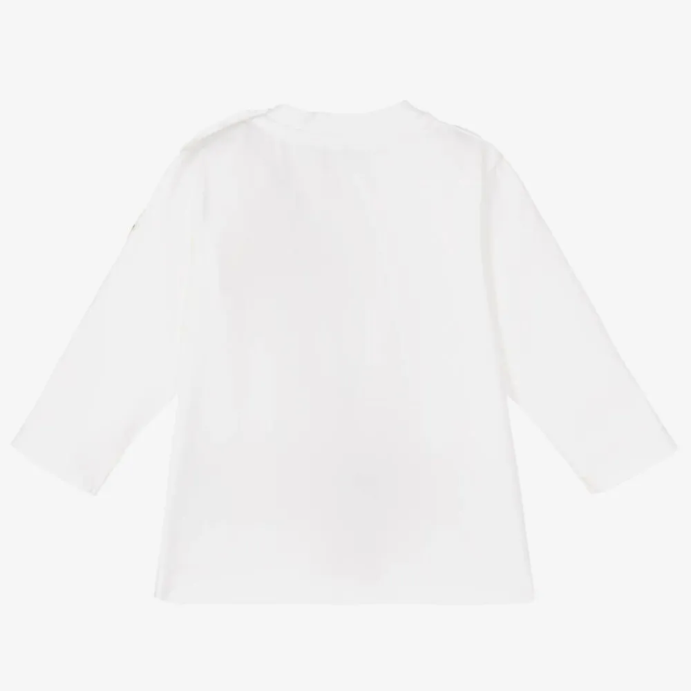 Boys white cotton long sleeved logo top by luxury brand Moncler Enfant, printed with a colourful logo print on the chest. Made in soft, comfortable cotton jersey, this casual top has a small crew neckline and useful branded popper fastenings on one shoulder. The brand's signature logo patch is appliquéd on one sleeve, for an added designer touch.