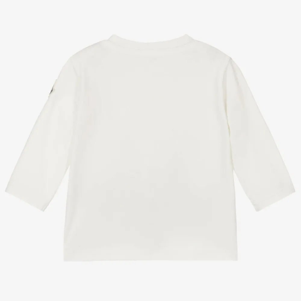 Ivory long-sleeved top for little girls from luxury brand, Moncler Enfant, made in soft, comfortable cotton jersey. It has a cute logo bear print on the front in ivory, pink and grey and the signature logo patch on one sleeve for an added designer touch. This useful wardrobe essential fastens with poppers on one shoulder for easy dressing.