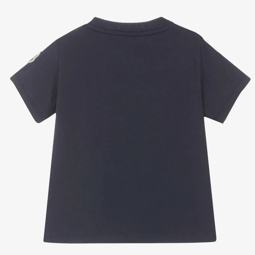 Younger girls navy blue cotton T-shirt by luxury designer Moncler Enfant, embroidered with the brand's logo across the chest in ivory. Made from soft jersey for casual comfort, the top has the brand's signature felt patch on one sleeve for added designer appeal and useful popper fastenings on one shoulder.