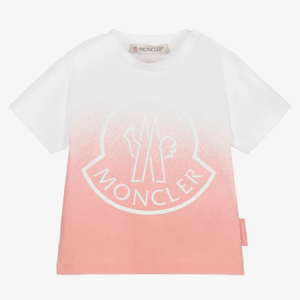 Cute and casual white and pink T-shirt for baby girls, by luxury French brand Moncler Enfant. Made in soft cotton jersey, it has the brand's signature logo printed on the front in white, and popper fastenings on one shoulder.