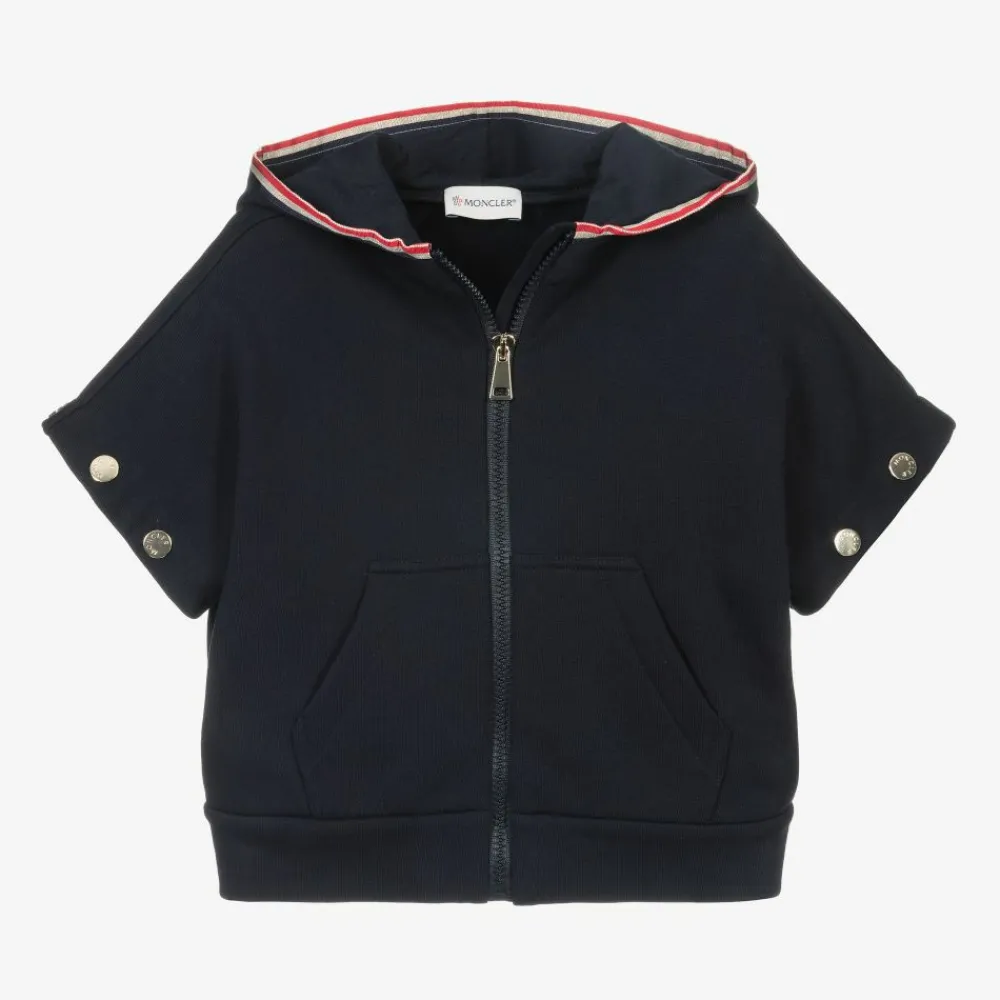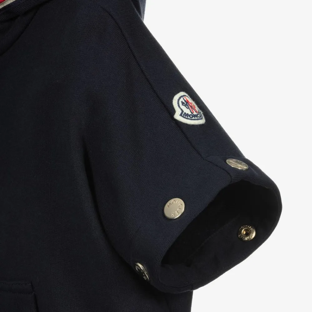 Sporty navy blue tracksuit for girls by French brand Moncler Enfant. Press studs on the sleeves allow the top to be worn with either long or short sleeves. The hooded zip-up top has sparkly gold and tricolour trims and a pouch pocket. The joggers have press stud closures at the sides, so can be worn open or closed for a relaxed look.