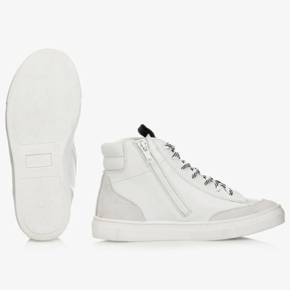 White high-top trainers for boys and girls by Moncler Enfant. Made in soft leather, they have black and white hiking boot style laces and useful zip fastenings on the sides. There are logos on the tongue and sides and ivory suede trims. Leather lined, they have padded heels, insoles and flexible rubber outer soles.