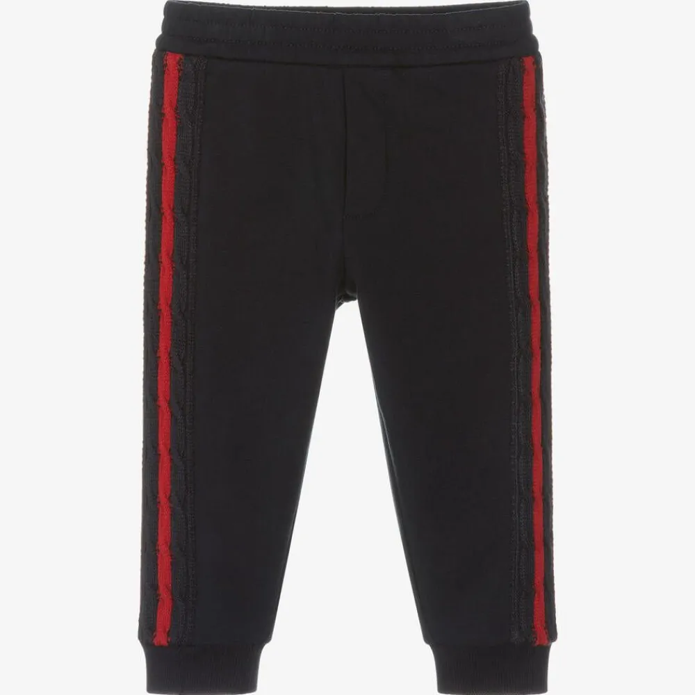 Navy blue joggers for boys by luxury French brand Moncler Enfant, made in soft cotton jersey with a warm fleecy inside. They have a knitted red and navy blue tape trim on each leg with ribbed ankle cuffs, and the brand's iconic logo patch on the back.