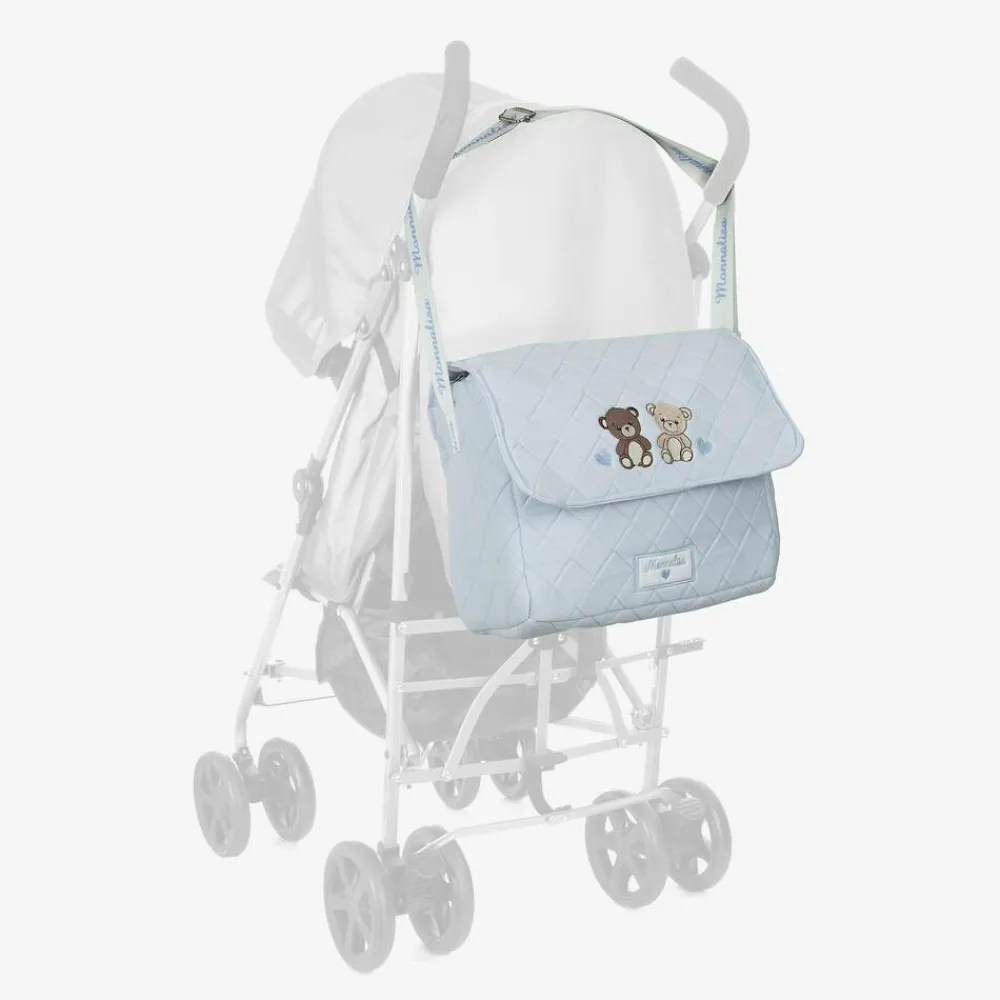 A quilted changing bag by Italian brand Monnalisa, designed in a pale blue colourway with diamond-shaped stitching. Embroidered with two adorable teddy bears, this roomy bag has a soft cotton jersey outer and a fully lined interior with five useful pockets. The main compartment fastens with a zip and it has an additional velcro flap over the top for added security. The white shoulder strap, printed with blue script logos, is fully adjustable for extra convenience. The bag comes with a foldable changing mat in a matching design.