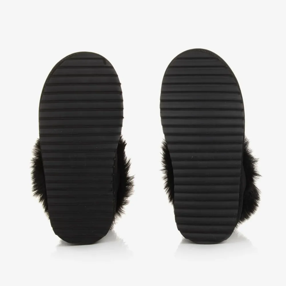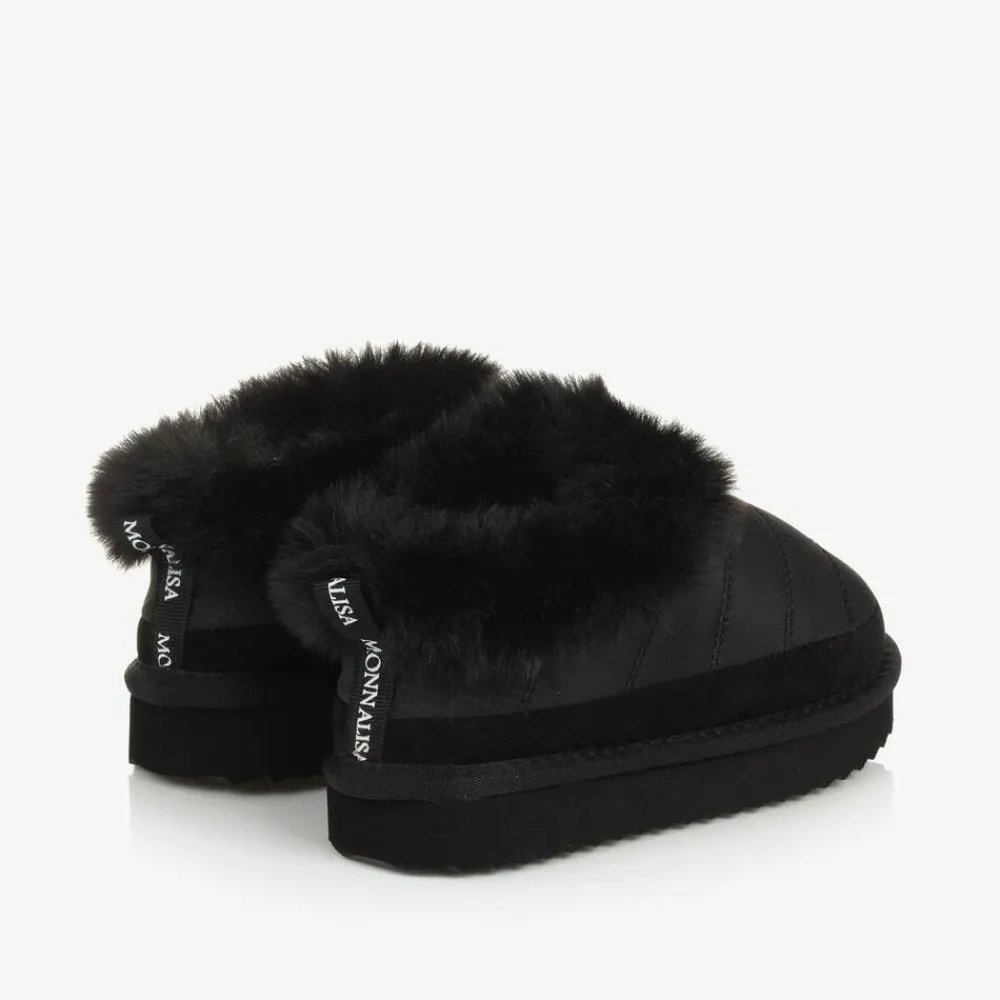 Casual and effortlessly stylish black slip-on ankle boots for girls by Monnalisa. They are made in lightly padded ripstop fabric with overstitching details and soft faux suede trims. The super soft faux fur full lining and trim at the low ankle cuffs give them a cosy cold-weather look. The platform rubber outsole is ridged for better grip.