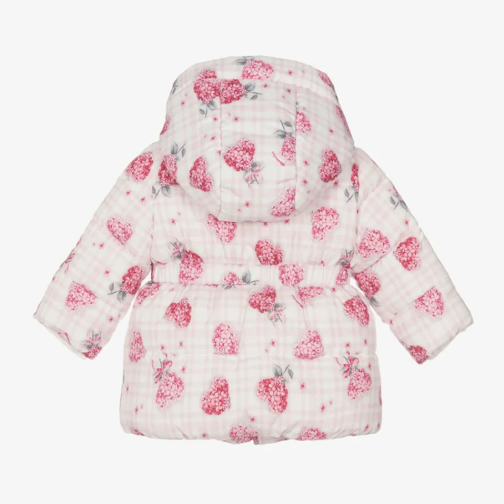 Pink and white checked puffer coat for girls by Monnalisa, with a pretty flower heart pattern which subtly incorporates the designer's signature logo. Silky smooth and warmly padded, it has a cosy fixed hood and a front zip fastening with a protective chin guard. To help keep out chilly winds, there is a gently elasticated hem and internal ribbed cuffs. This lovely coat has useful side seam pockets, an elasticated waist and an embroidered logo on one sleeve.