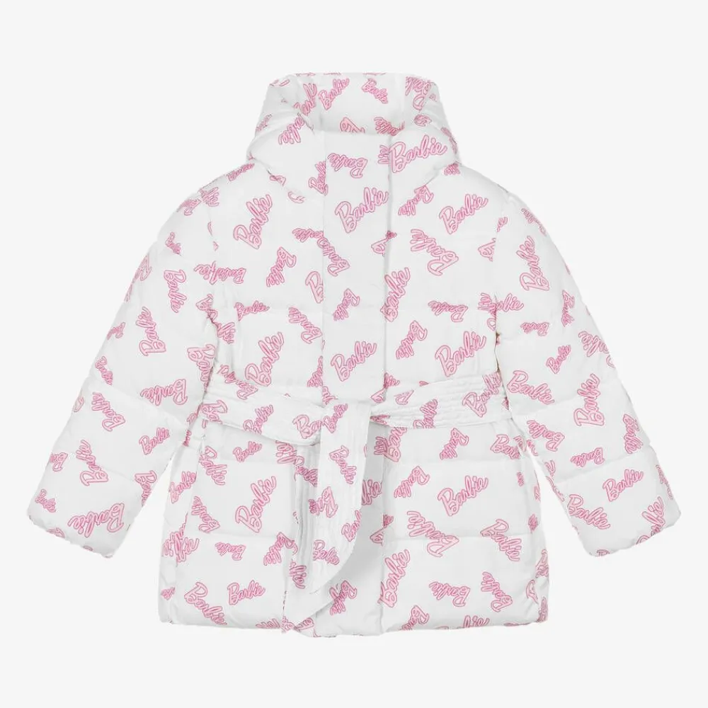 White puffer coat for girls by Monnalisa, with an eye-catching pink Barbie print. Smooth and silky, it is warmly padded, with an attached hood and a popper-fastening flap over the front zip for extra protection against the cold. The detachable belt fastens in a pretty bow.