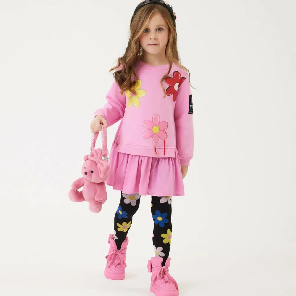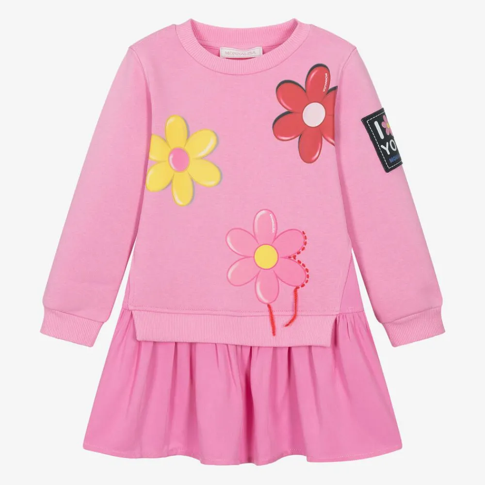 A fun pink sweatshirt dress for girls by Monnalisa, made in a comfortable cotton blend with a black logo patch on one sleeve. The long-sleeved jersey bodice has a casual crew neck and ribbed detailing on the hem and cuffs. It has brightly coloured flowers printed on the front, one outlined with red stitching and the others with white logo prints on one petal. The skirt has a gently gathered seam and is made in soft twill for contrast in textile design.