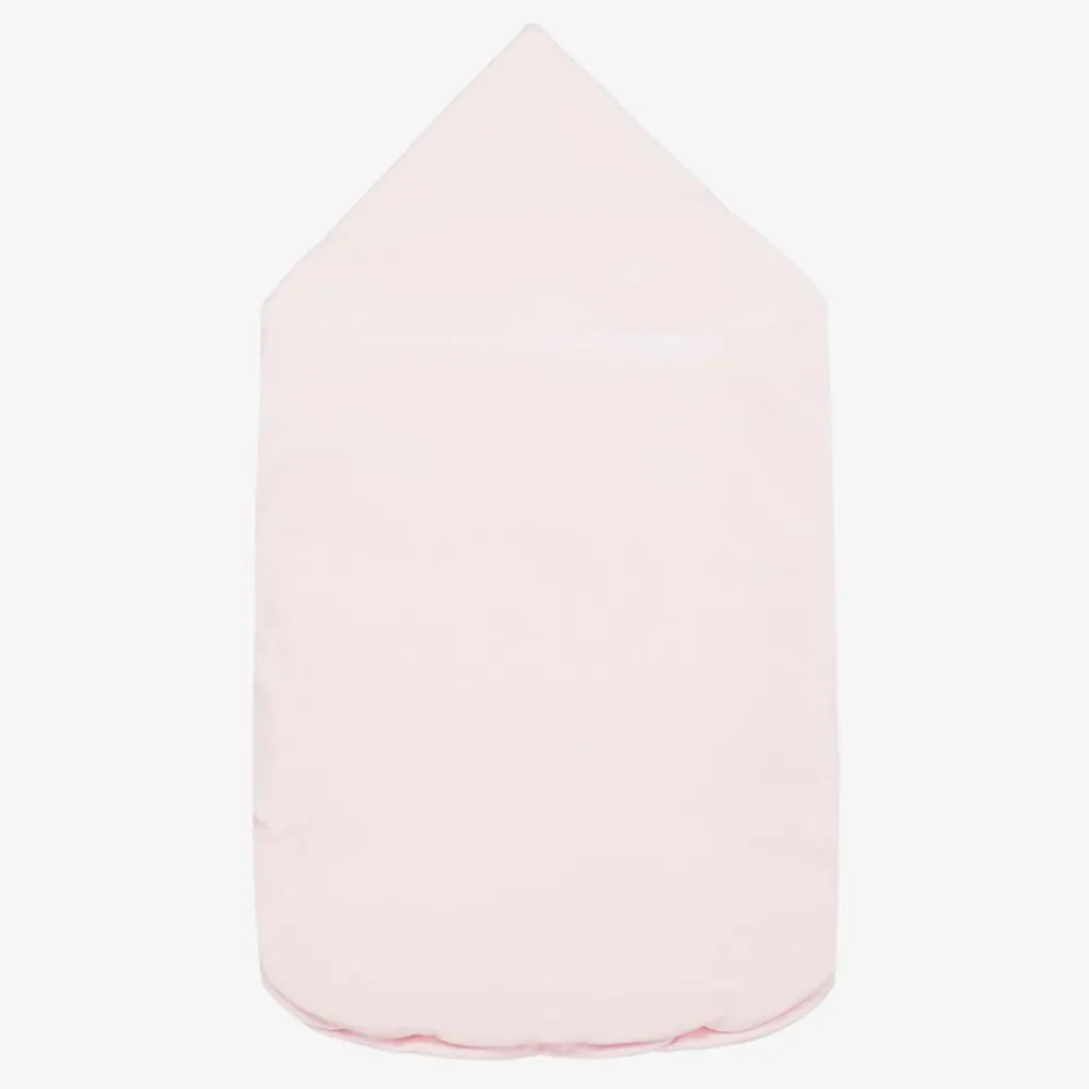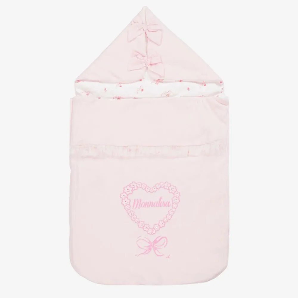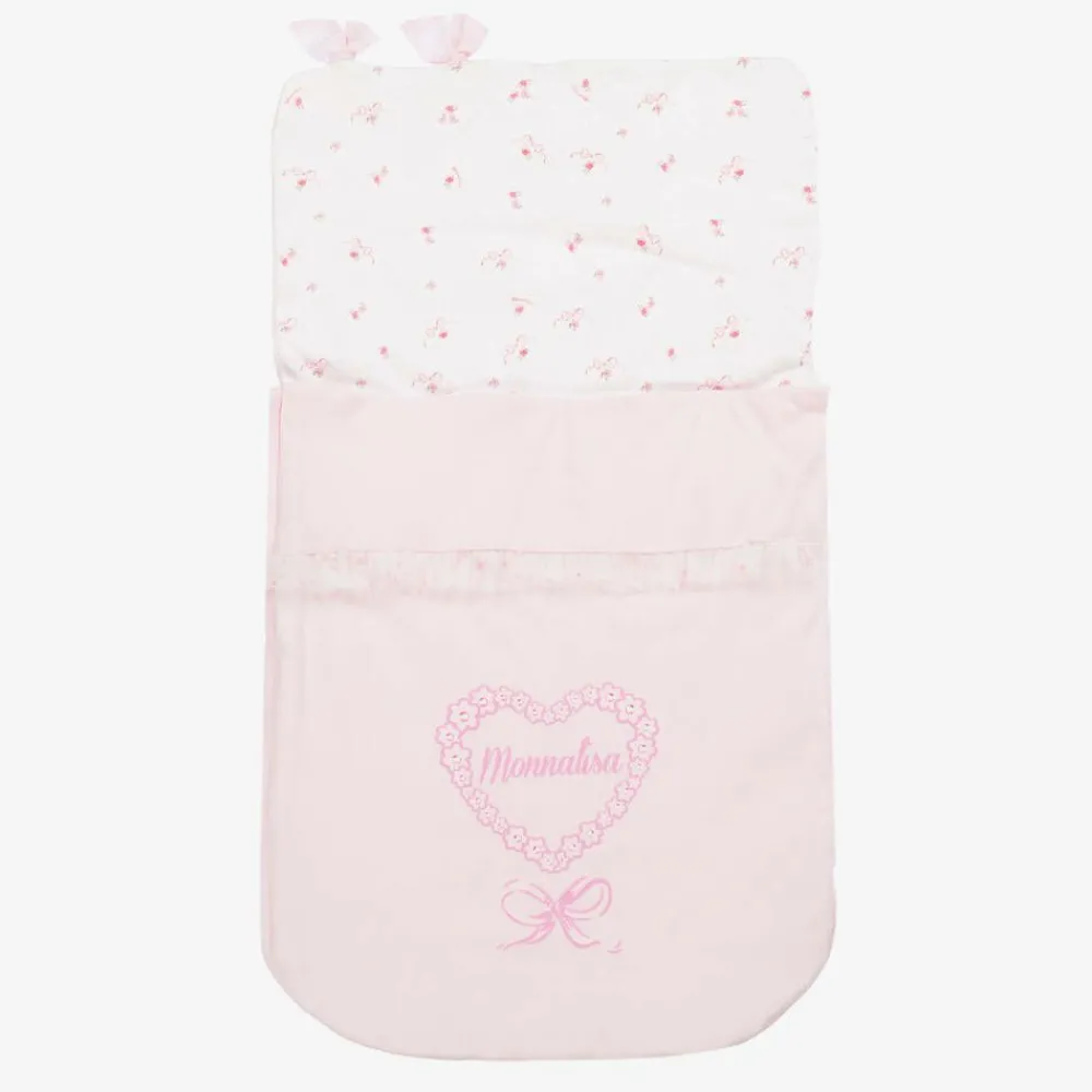 A delightful pink nest for baby girls by Monnalisa, softly padded for cosy comfort. The front has a pretty flowery heart and ribbon bow motif, incorporating the designer's signature logo. It is made in stretchy cotton jersey, with a zip fastening on the side and base for easy access. The ivory lining is delicately patterned in grey dots, dainty flowers and ribbon bows. Trimmed with sweet bows, the hood secures with poppers and can be opened out to form a soft pillow.