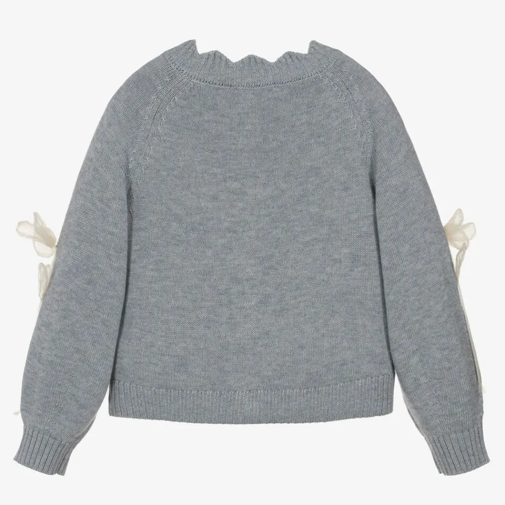 Gorgeous grey cardigan for girls by Italian brand Monnalisa, with beautiful, ivory georgette rose appliqués on the long sleeves. Made in a super soft knit with a touch of wool, it has a scalloped neckline with cosy ribbed trims and sparkling, diamanté button fastenings on the front.