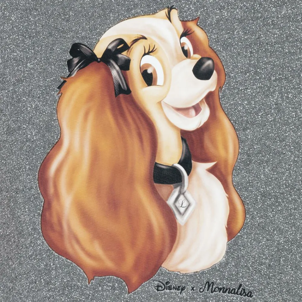Sparkly silver hoodie for girls by Italian brand Monnalisa, with Disney character 'Lady' of 'Lady & the Tramp' printed on the front. Glittering with silver thread, it is made in comfortable, cotton-blend jersey, with a stylish split seam on the back, held together with a spotted black bow appliqué. It has long sleeves, ribbed trims and a cosy, fleecy inside, just right for cooler days.