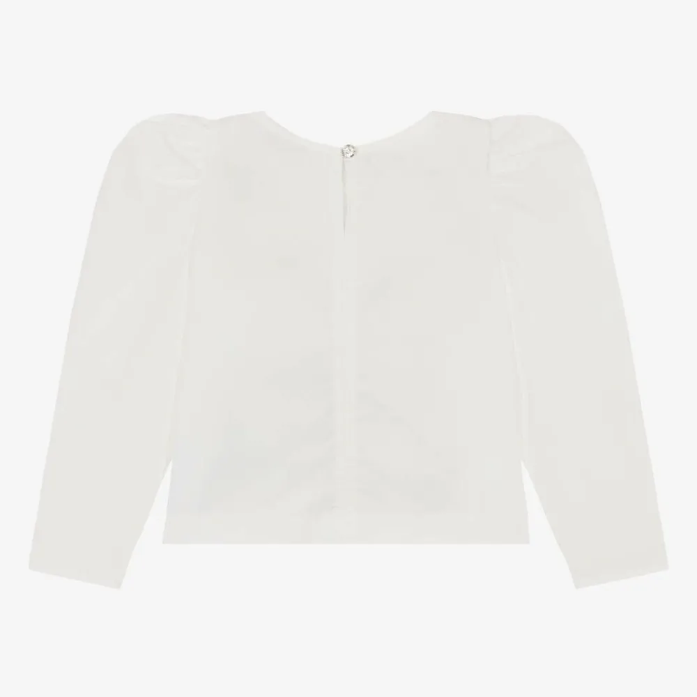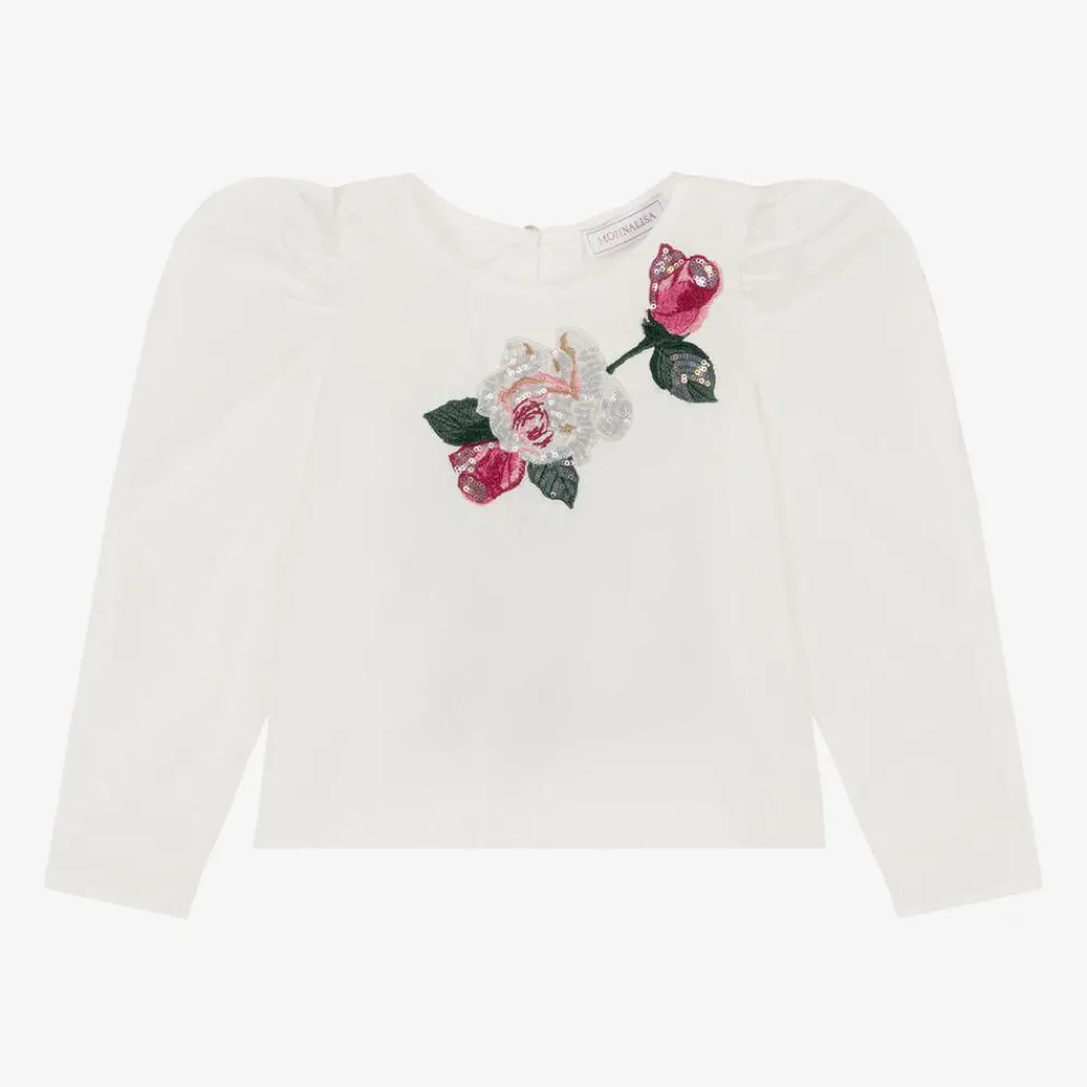 Smart ivory cotton blouse for girls by Italian designer Monnalisa, just right for making an entrance in. It has a beautiful sequinned and embroidered flower appliqué shimmering on the front, and dramatic, leg-of-mutton style, long sleeves. Made in lightweight poplin, it has a crystal keyhole button fastening around the back.