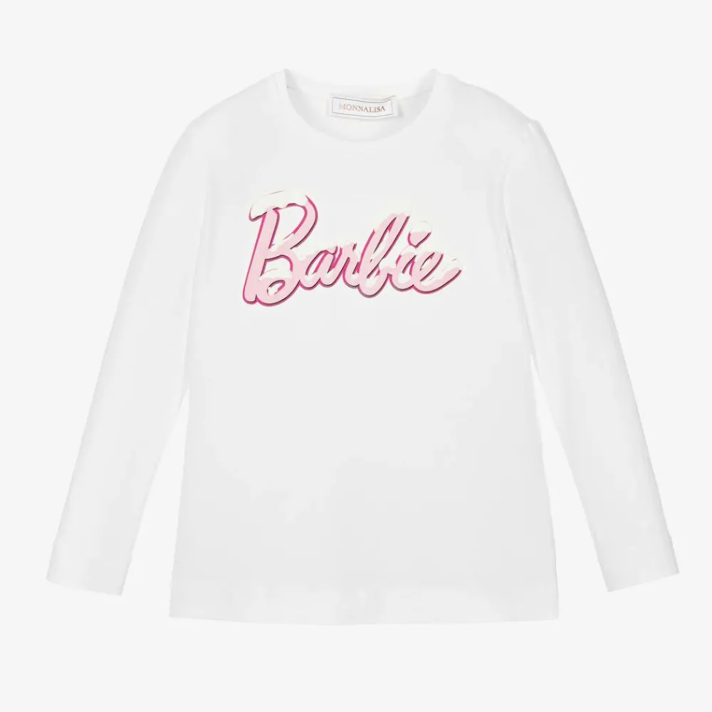 From Monnalisa, a white cotton top for girls with a large pink logo on the front. This long-sleeved jersey top is part of the official Barbie⢠collection.