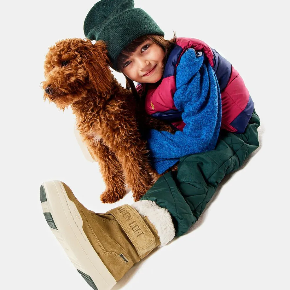 Light brown suede leather ankle boots for boys and girls from Moon Boot, with faux fur trim and branded details. Offering a stylish city look combined with technical features for more challenging conditions, they are fully waterproof and have a bouncy EVA sole, textured for good grip. Padded and lined for warmth and comfort, they have an easy, velcro-fastening strap.