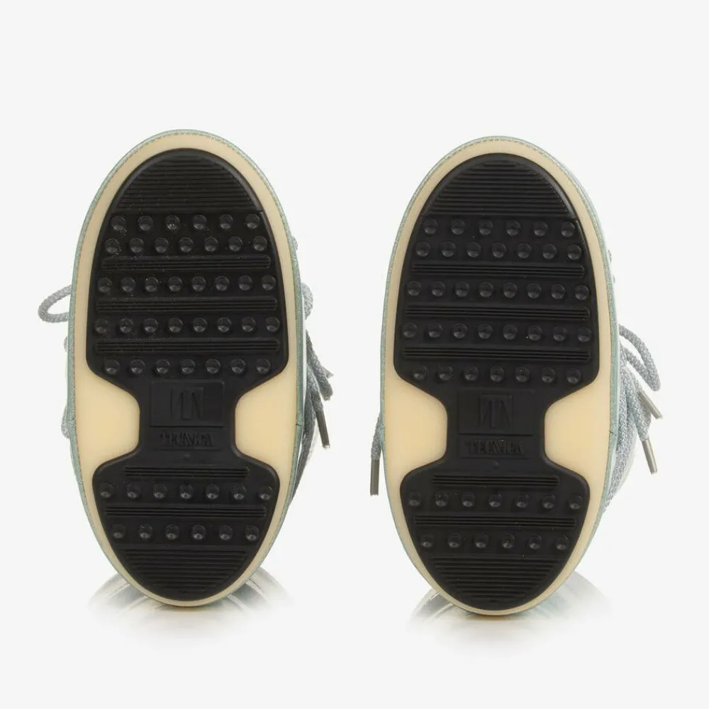 Glittery light blue snow boots for girls by Moon Boot, inspired by the 1969 moon landing. Glossy, water-repellent and heavily padded for warmth, they have decorative tie-up laces. The thermoplastic rubber soles feature tiny suction cups for added grip on slippery surfaces. The technological foam lining will feel snug at first but will mould to the size and shape of the foot after a few hours of wear. Bold logo branding completes the statement après-ski look.