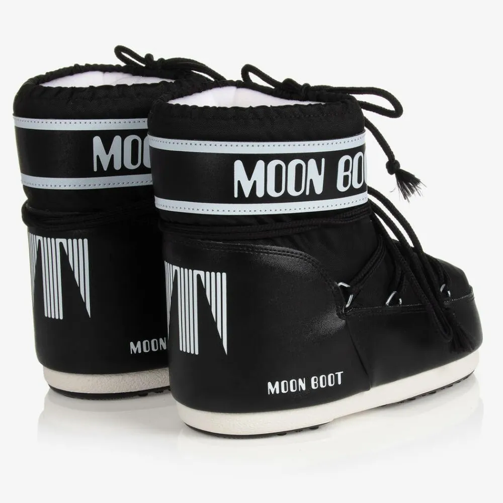 Black and white shorter-length snow boots for boys and girls by Moon Boot, with a bold logo print panel for an iconic look. Heavily padded and ultra resistant in the signature style, they feature a two-tone thermoplastic sole with little suction pads at the bottom for better grip. They have branded faux leather trims, a stylish lace-up look and drawstrings on each ankle to lock in warmth. The technological foam lining will feel snug at first but will mould to the size and shape of the foot after a few hours of wear.